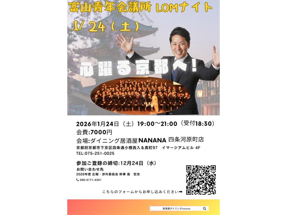 年始早々ではございますが、1月に開催される京都会議ならびに、富山青年会議所としての懇親の場であるLOMナイトについてご案内いたします。