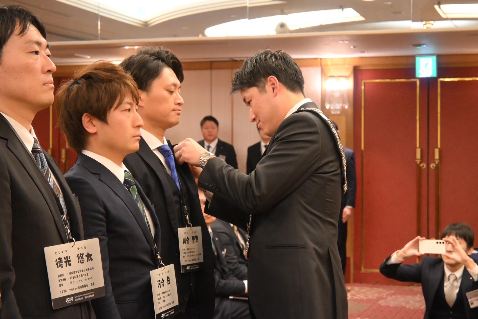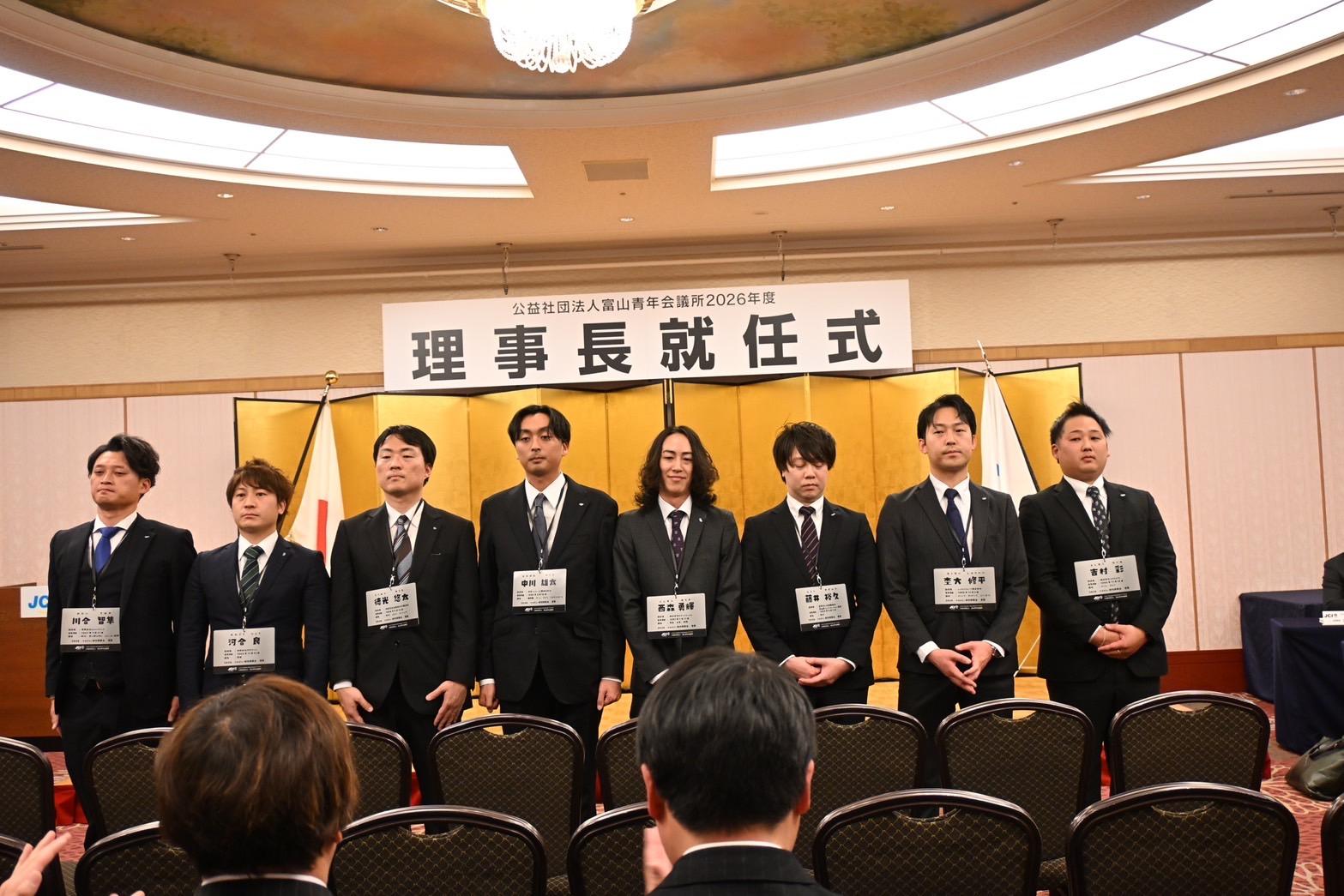 理事長就任式のでは、西村理事長よりバッジを頂戴し、改めて富山JCの一員になったのだと強く実感いたしました。その瞬間は、これから始まるJC活動への期待と同時に、身の引き締まる思いを感じたことを今でも鮮明に覚えております。