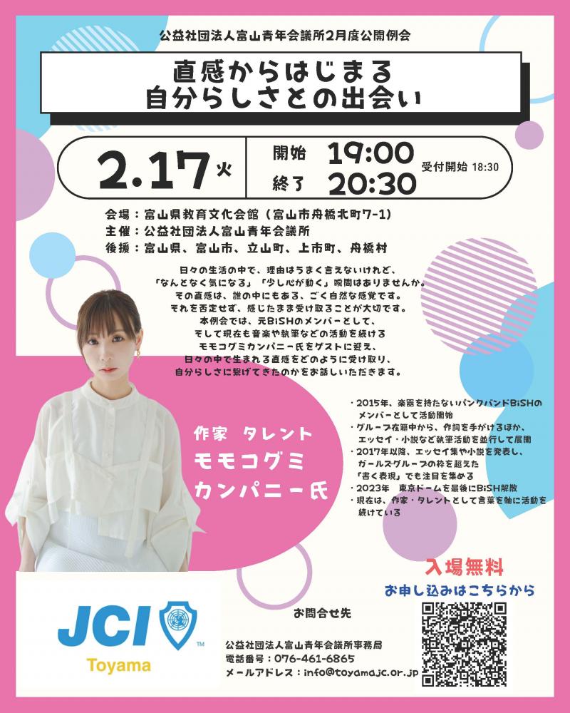 富山青年会議所の公式X・インスタグラムではモモコグミカンパニーさんから公開例会の告知動画メッセージが掲載されていますので拡散お願いします!!