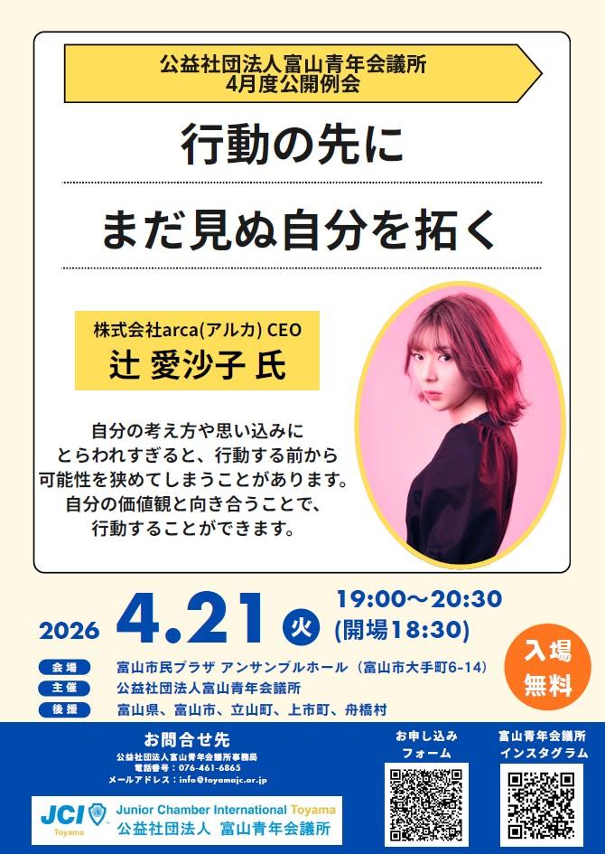 4月度公開例会は講師に辻愛沙子氏をお招きし、ご講演していただきます。辻愛沙子氏は報道番組『news zero』の水曜パートナーとしてレギュラー出演をされていました。他にも社会課題への取り組みなど様々な活動をされ、ご自身の決断を行動に移してきました。本例会ではそんな辻愛沙子氏ご自身のリアルな実体験を通して、前向きな想いがある時も、不安や迷いがある時も、自分の価値観と向き合う大切さを参加者に伝えていただきます。2月度公開例会で学んだことを活かして、参加者の学びになる公開例会にするべく委員会一同、全力で取り組んでいきますので、皆さまのご出席よろしくお願いします!